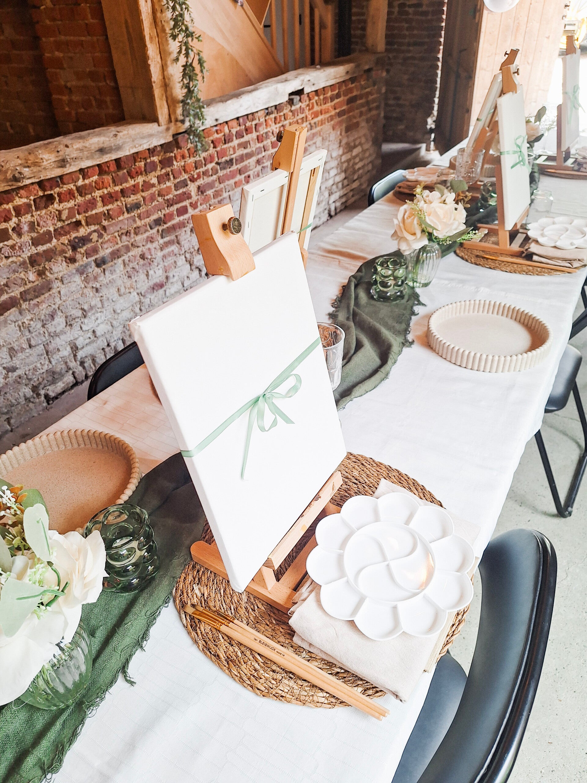 Tafels, stoelen, glazen, drank, muziek, schorten én al het schildermateriaal. Zo kun jij zorgeloos genieten.